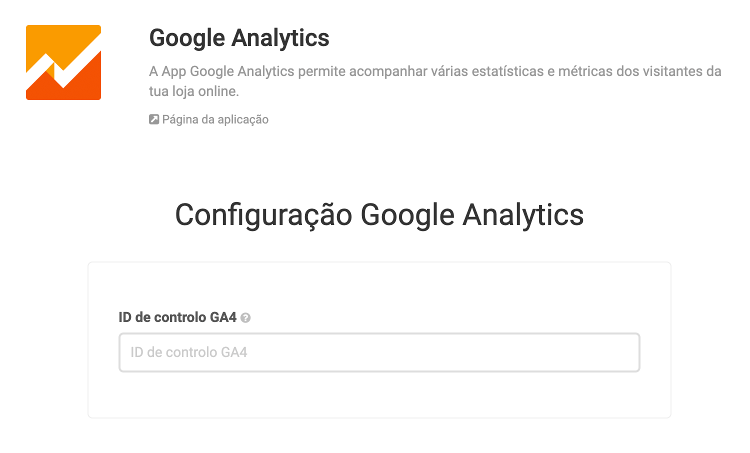 A configuração e ativação da app Google Analytics, no menu Apps / Análise, requer apenas o preenchimento do campo ID de controlo GA4. Deves colocar o ID de controlo obtido no passo anterior, no formato G-XXXXXXXXXX.