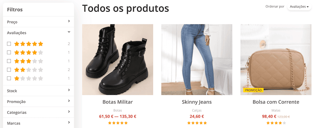 Para além disso, o filtro Avaliações, disponível nas páginas de listagens de produtos da loja, apenas se encontra disponível nos templates que tenham a funcionalidade de filtros de produtos disponível.