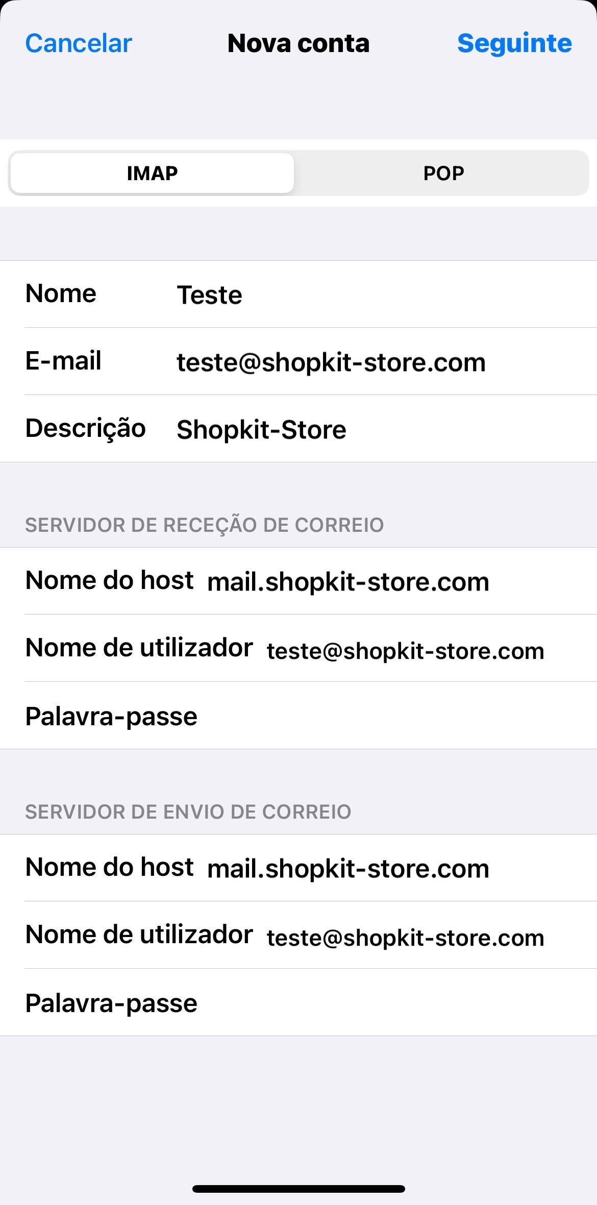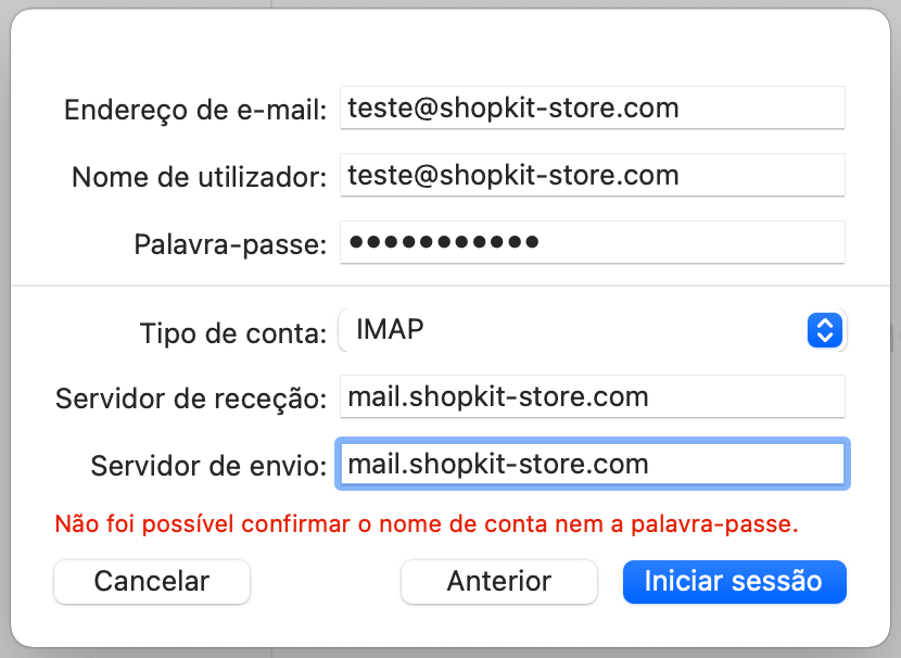 Certifica-te de que tens escolhida a opção IMAP no campo Tipo de conta e preenche os campos Servidor de receção e Servidor de envio. Deverás colocar da seguinte forma: mail.oteudominio.com.