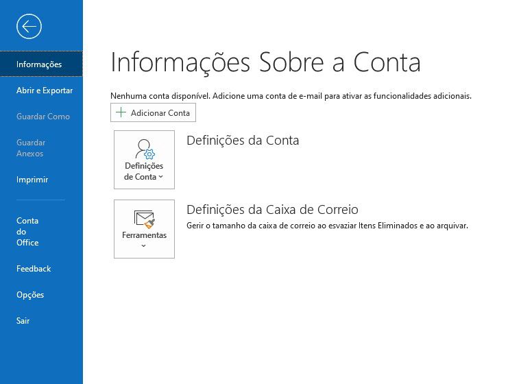 Acede ao separador Ficheiro e, posteriormente, clica em Adicionar Conta.
