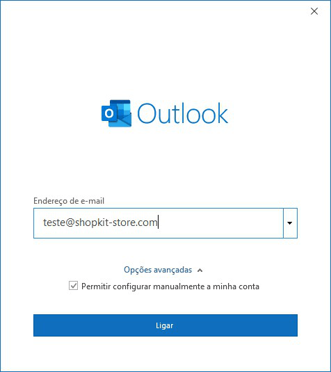 Introduz o e-mail pretendido e, em Opções avançadas, ativa Permitir configurar manualmente a minha conta. Avança para o passo seguinte em Ligar.