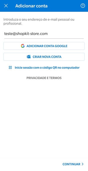 Ao abrires a aplicação Outlook, insere o e-mail que pretendes utilizar e avança para o passo seguinte em Avançar.