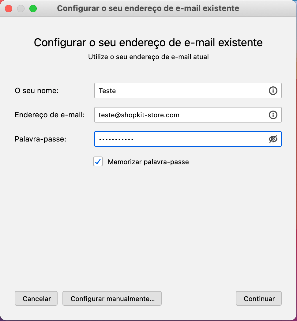 Na janela que surgir, deves preencher os campos: O seu nome, Endereço de e-mail, Password e, por fim, selecionar a opção Configurar manualmente.