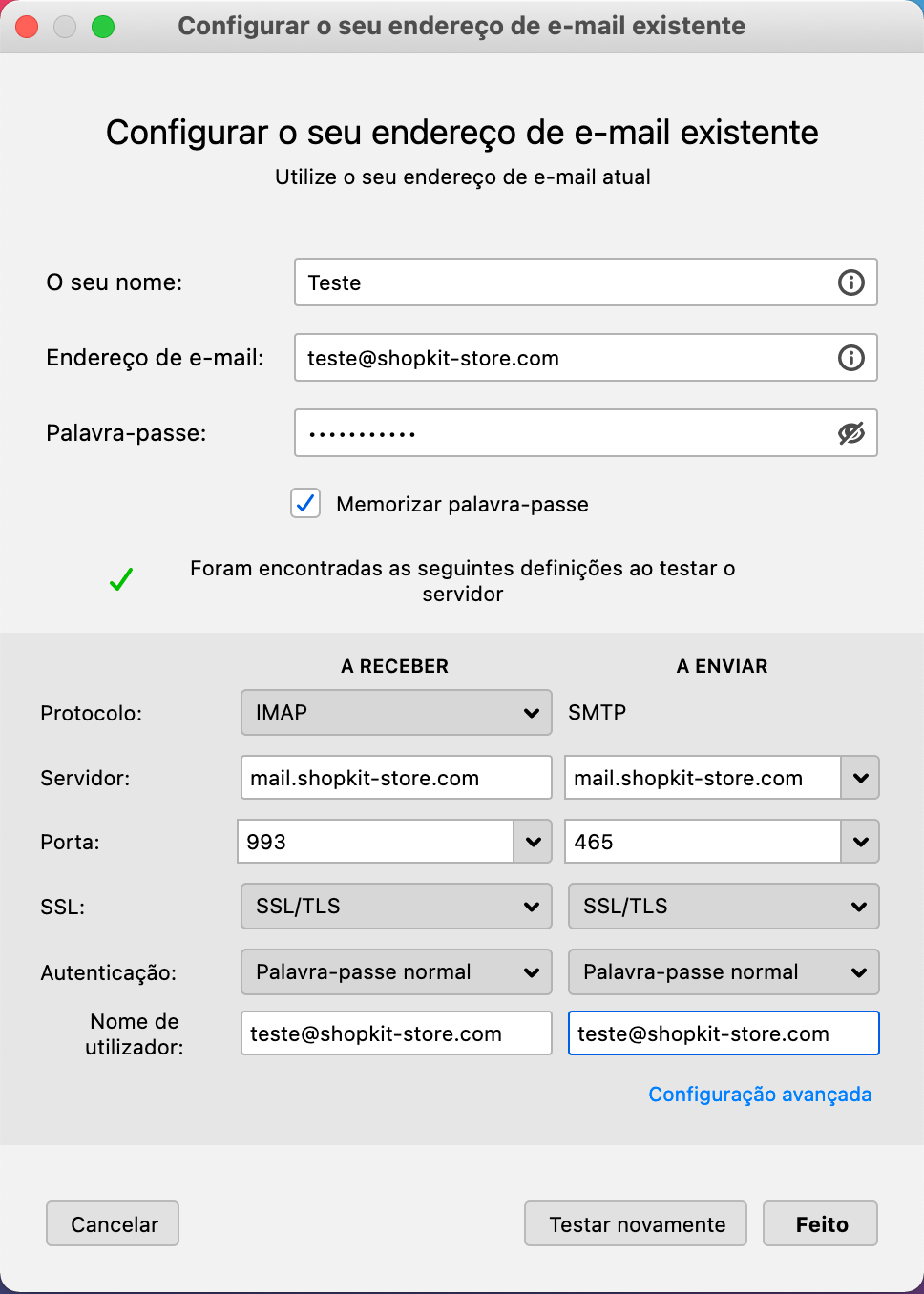 Agora, deves inserir mail.oteudominio.com em ambos os campos Servidor, assim como a selecionar a porta 993 no servidor A Receber e a 465 no servidor A Enviar.