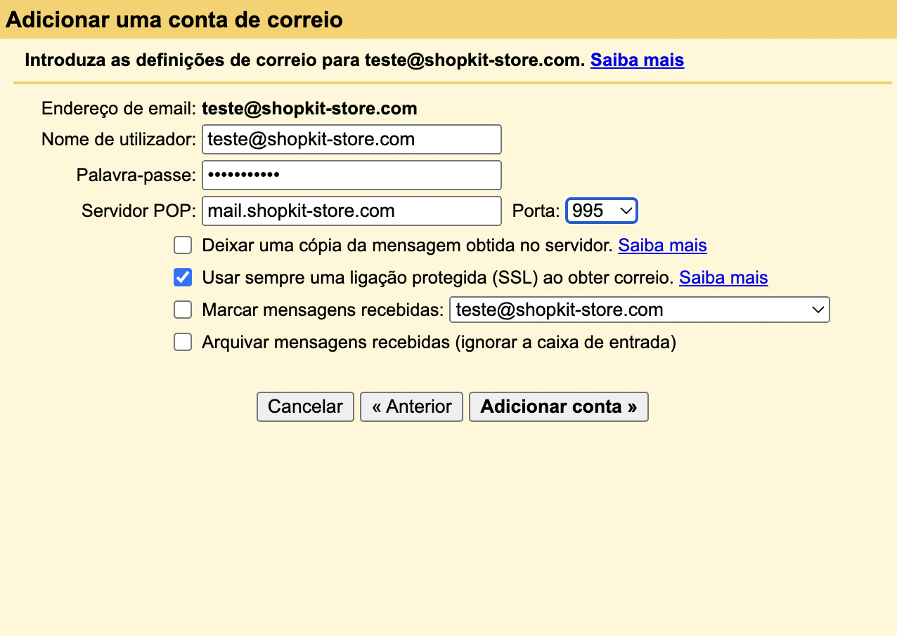 Para concluíres a configuração da tua conta de e-mail, tens de preencher os campos: