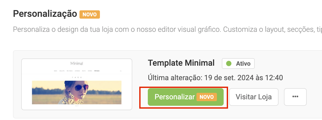 O template Minimal está aplicado por defeito quando crias a tua loja online, pelo que se não alterares o template, não é necessário ativá-lo.