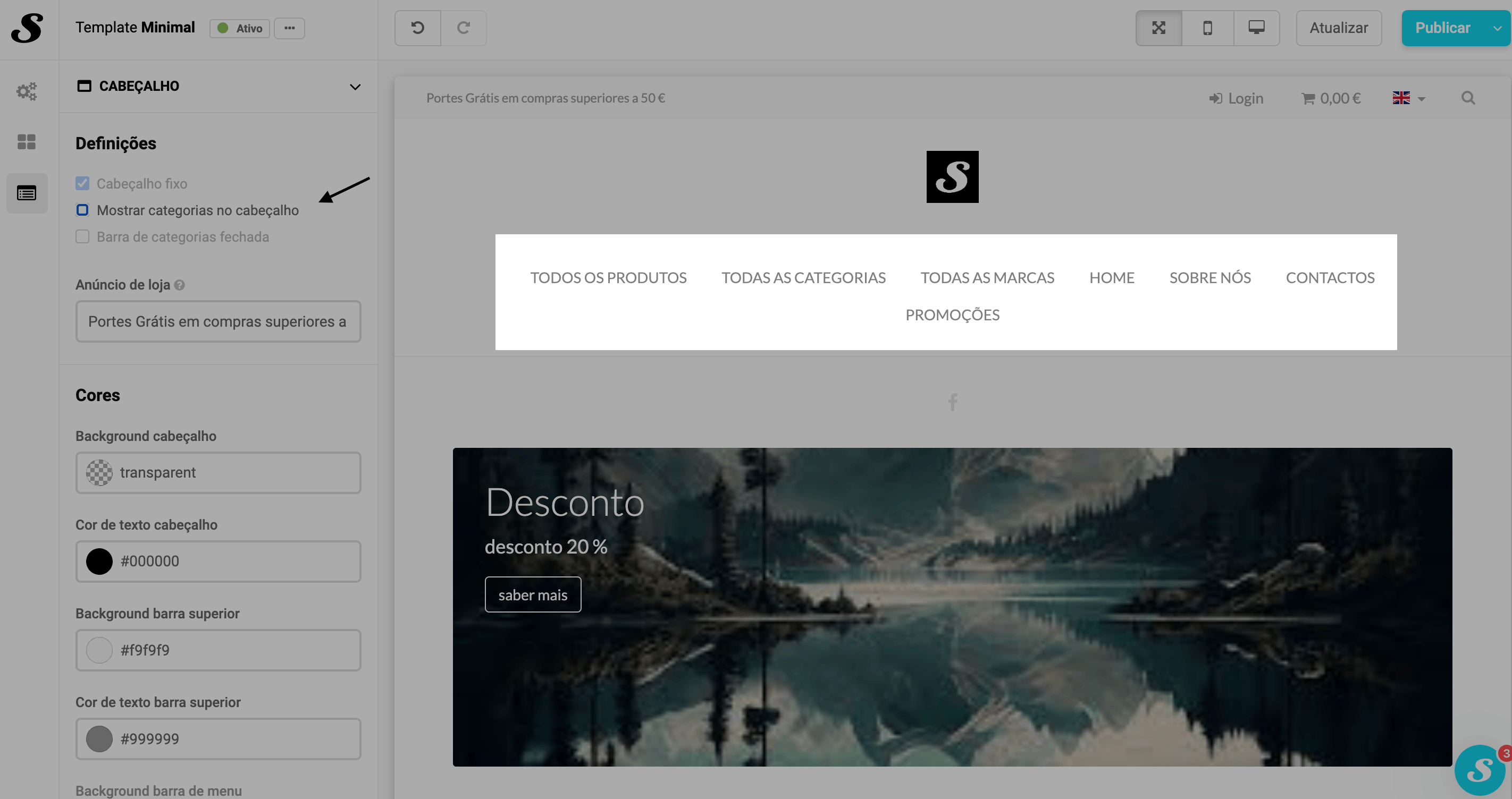 No entanto, podes alterar o menu de navegação principal para que mostre páginas de conteúdo, ao aceder ao menu Secções / Cabeçalho / Definições, e desativar a opção Mostrar categorias no cabeçalho.