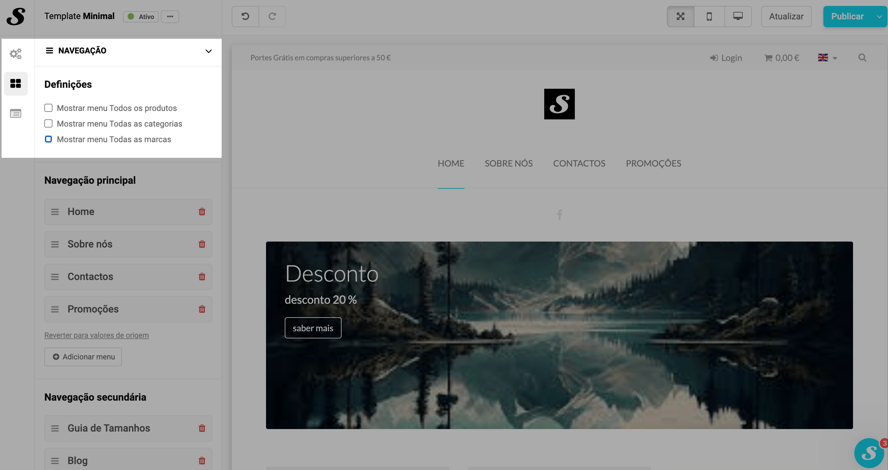 Por defeito, a navegação principal do template Minimal é composta pelas categorias de produtos que criares e pelos menus nativos Todos os Produtos, Todas as Categorias e Todas as Marcas.