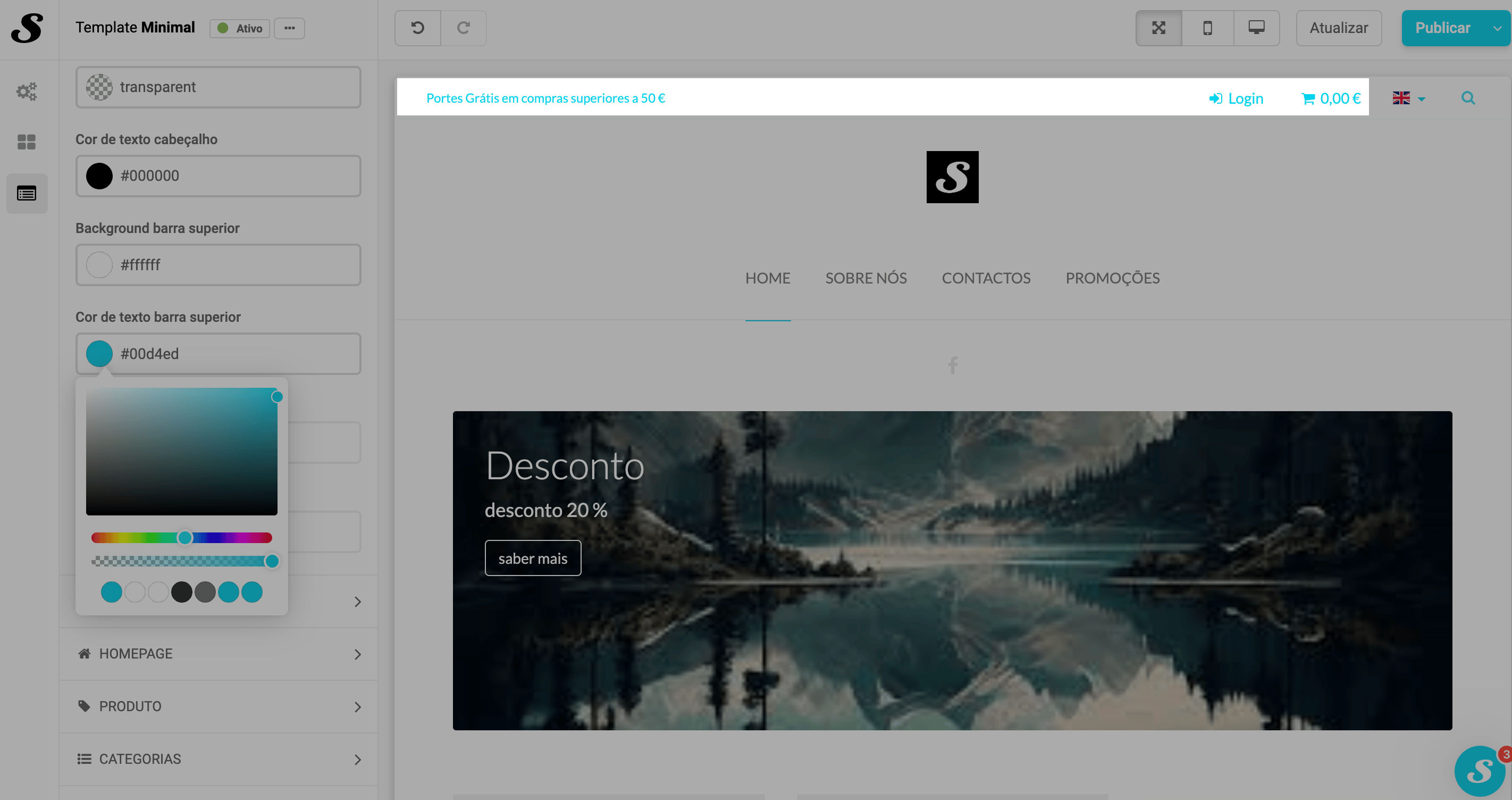 O template Minimal permite ter uma loja online com uma aparência minimalista. Tal como noutros templates, podes personalizar a aparência da tua loja com diversas configurações.