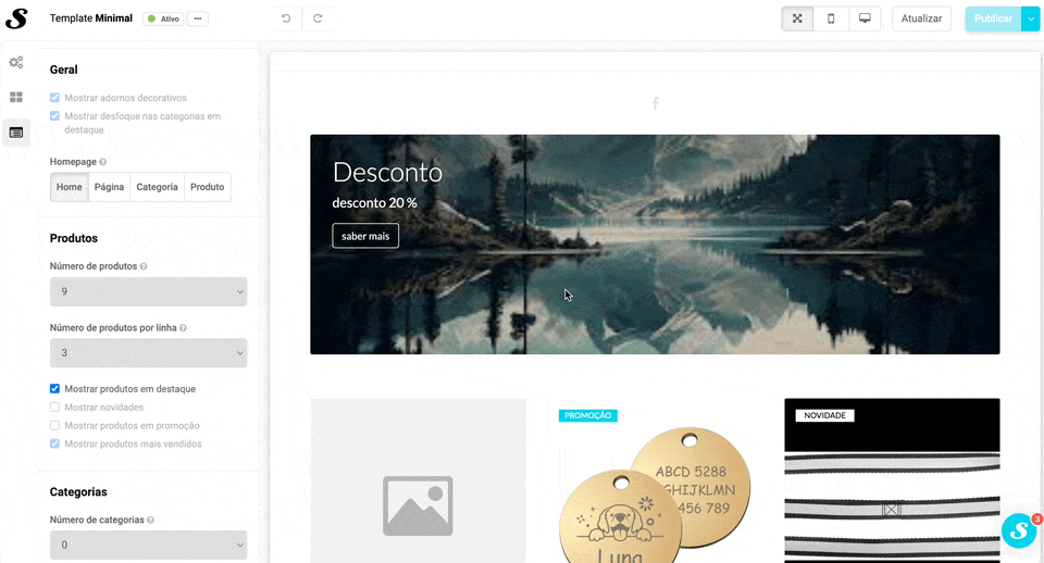 No template Minimal, na homepage da loja são apresentados produtos com o atributo Produto é destaque. Este atributo é definido na ficha de cada produto, no menu Produtos. Podes saber mais sobre os produtos em destaque no nosso artigo de suporte.