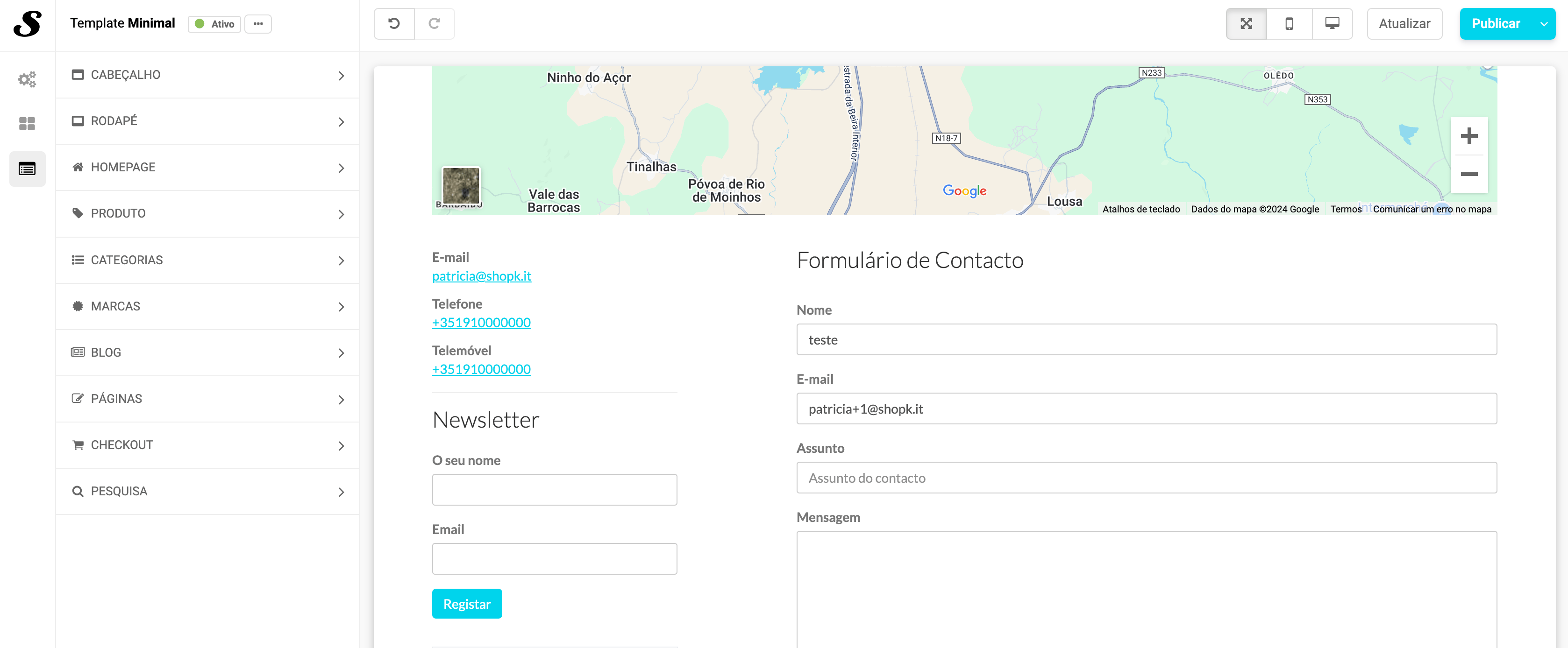 No template Minimal, a secção Newsletter surge na página de Contactos.