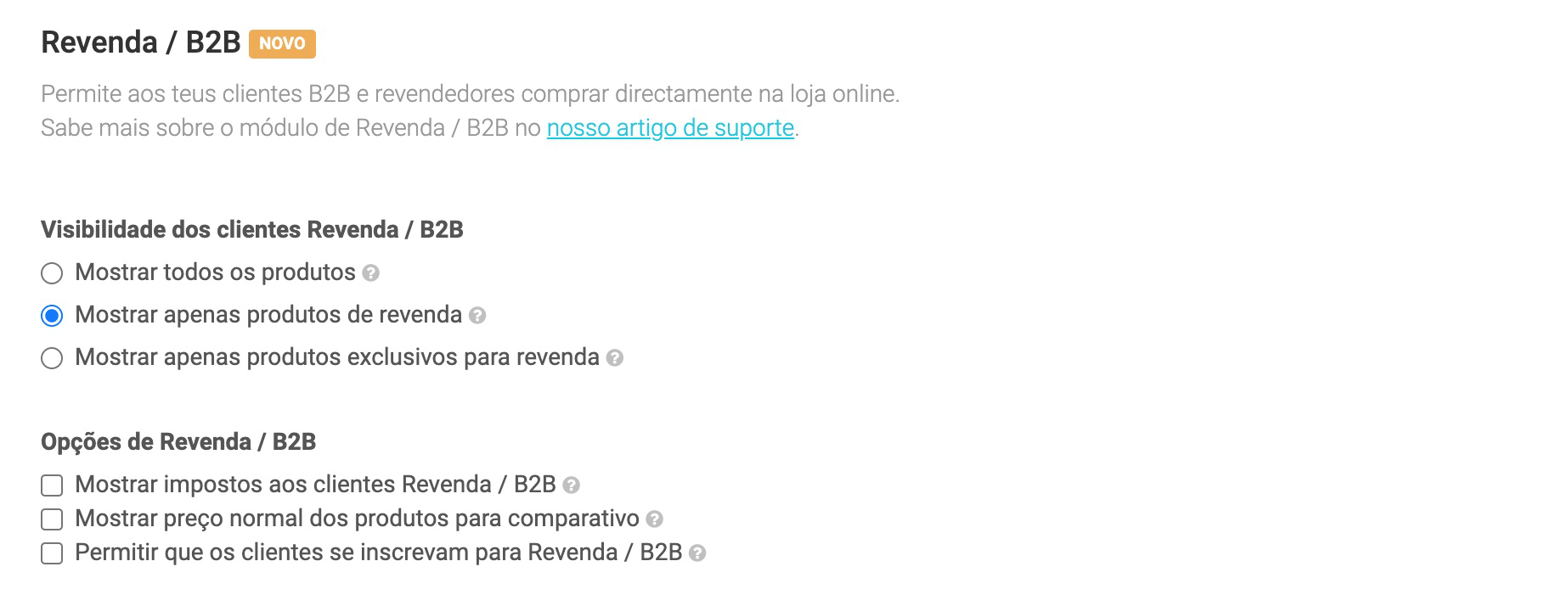 Se ativares esta opção, os clientes Revenda / B2B visualizam apenas os produtos configurados como produtos revenda.