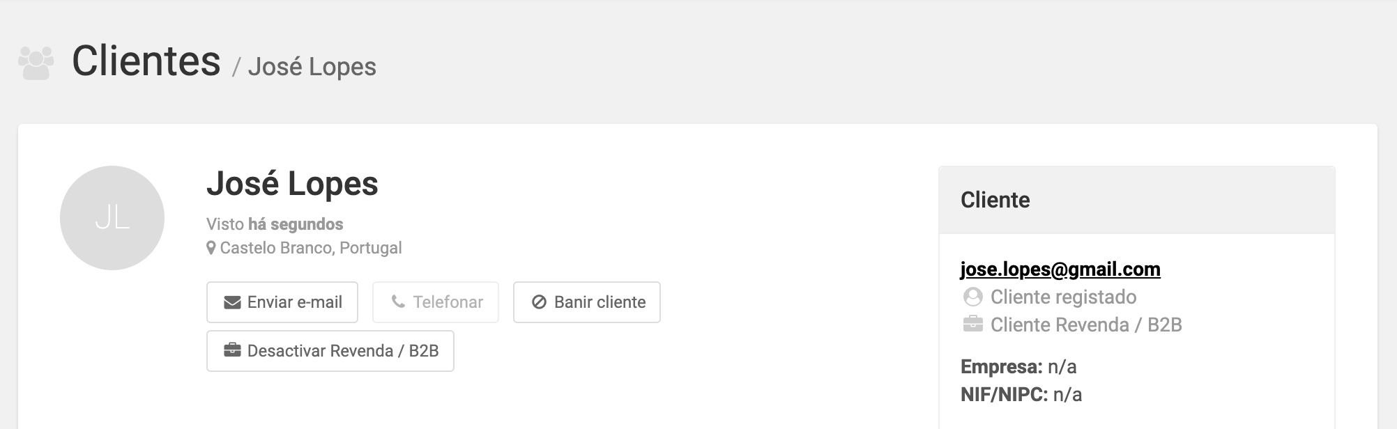 Caso o cliente já se encontre registado e pretenda tornar-se num cliente revendedor (B2B), basta aceder à sua ficha de cliente, no menu Clientes, e clicar em Ativar Revenda / B2B.