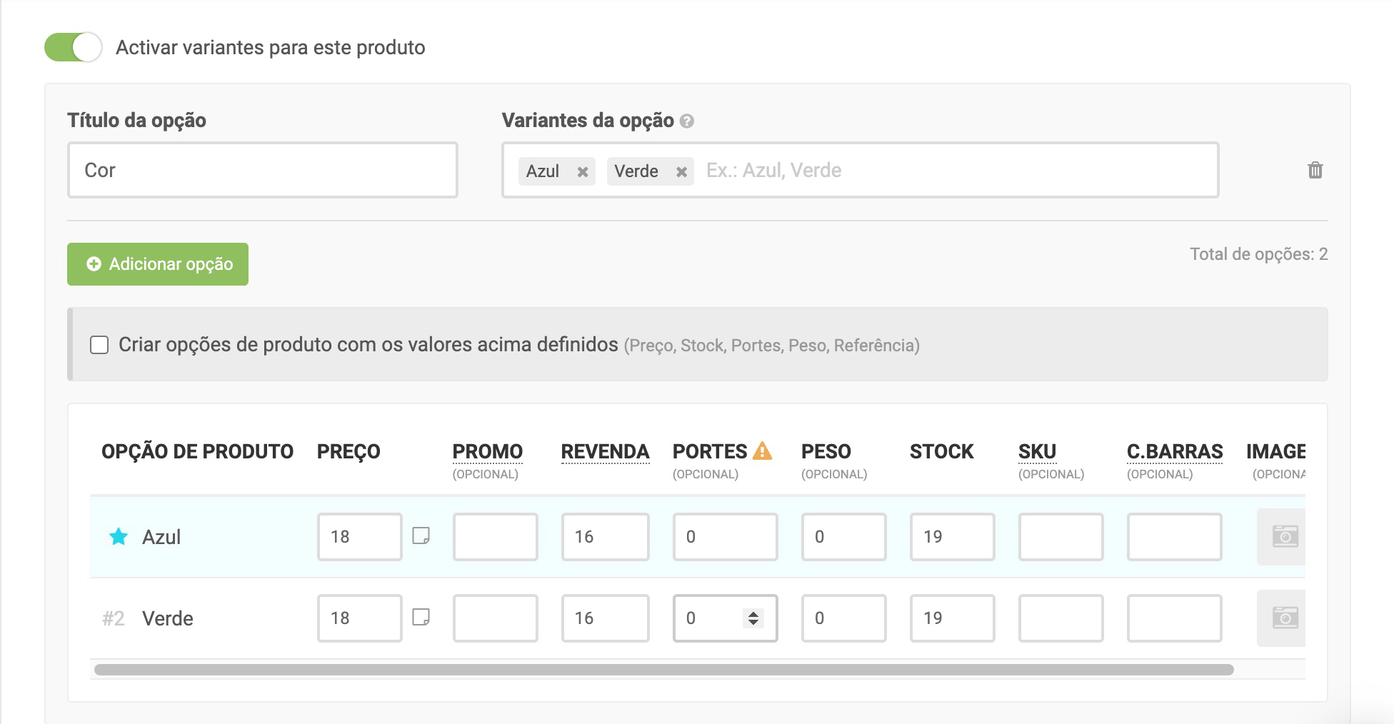 Caso o produto seja composto por opções, deves também preencher o campo Revenda, com o preço de revenda que pretendes.