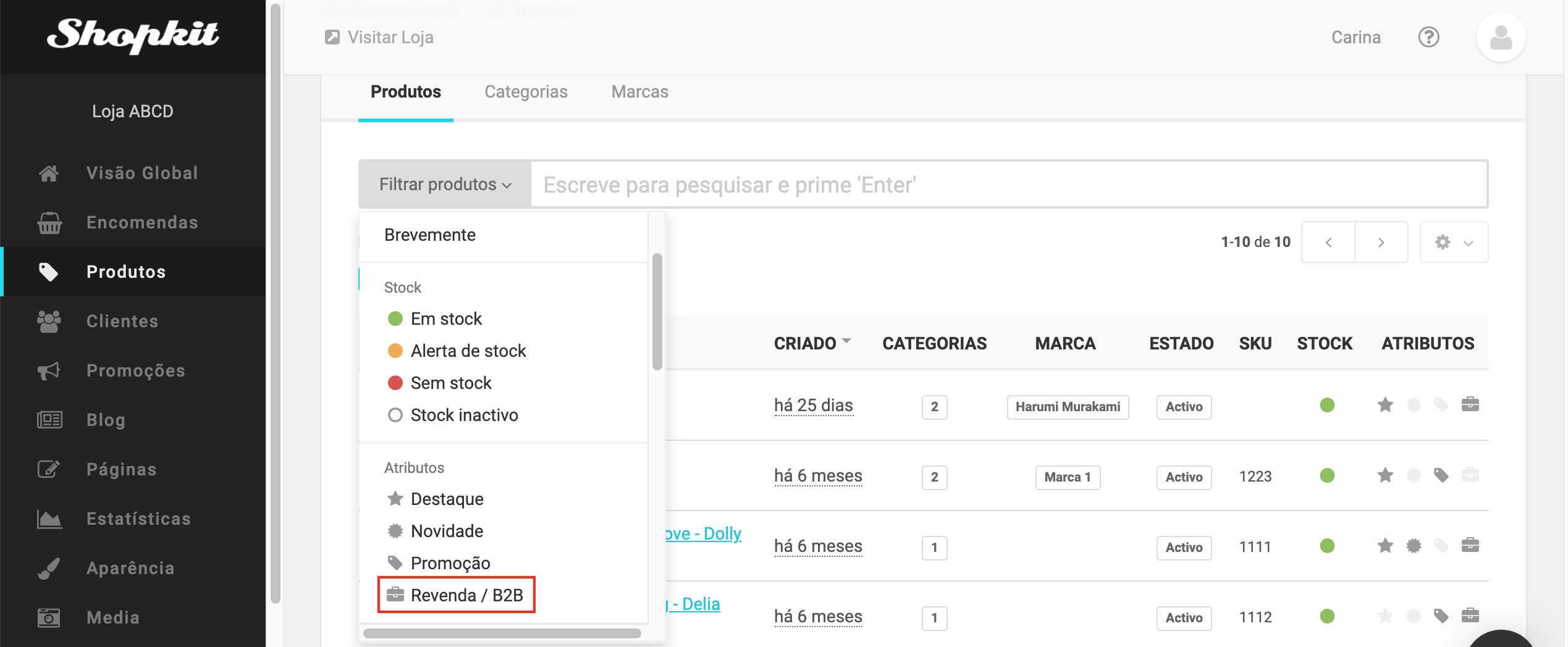 No menu Produtos, consegues filtrar os produtos de revenda e exclusivos de revenda através do atributo Revenda / B2B no botão Filtrar Produtos.