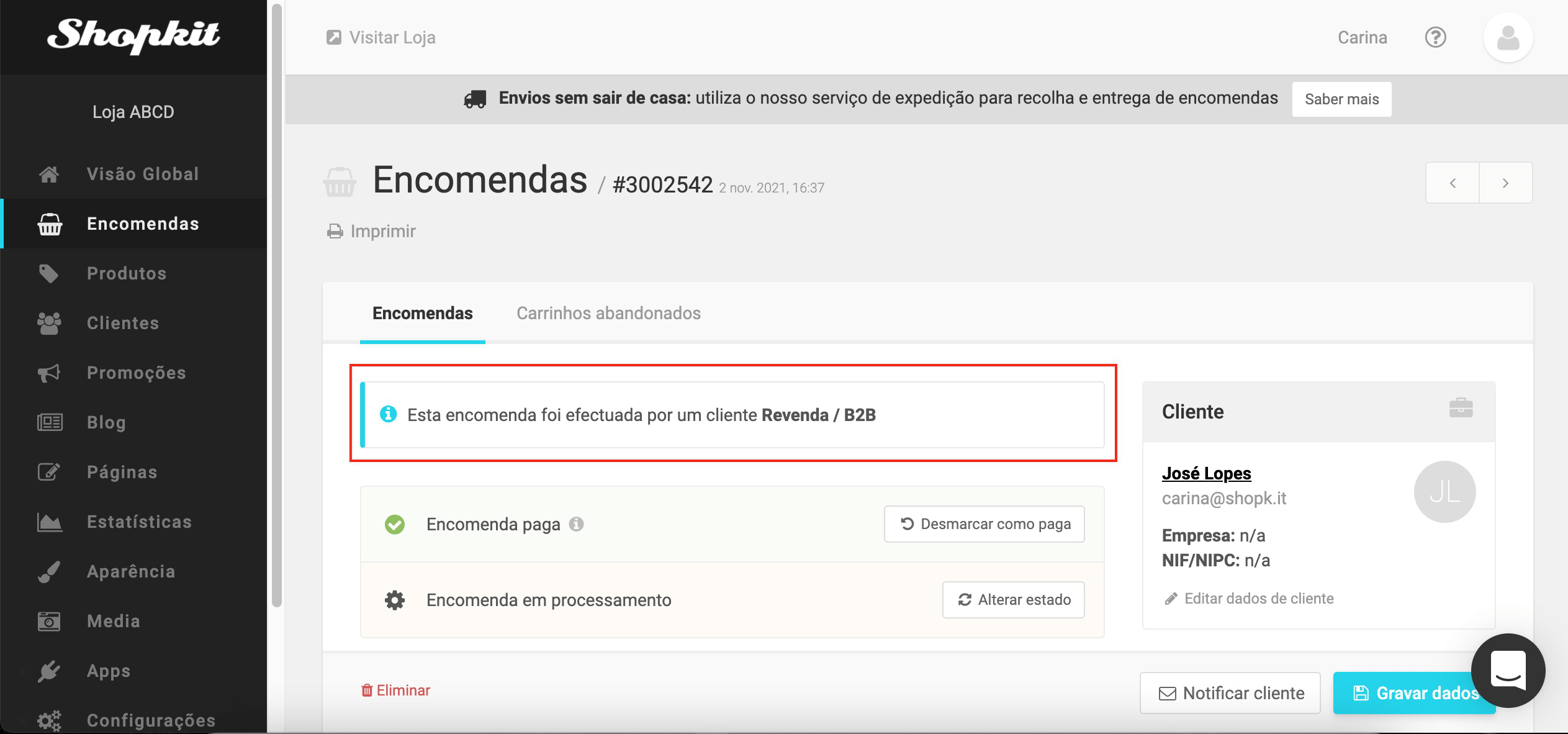 As encomendas efetuadas por clientes revendedores são identificadas com um aviso no topo da página de detalhe da encomenda.
