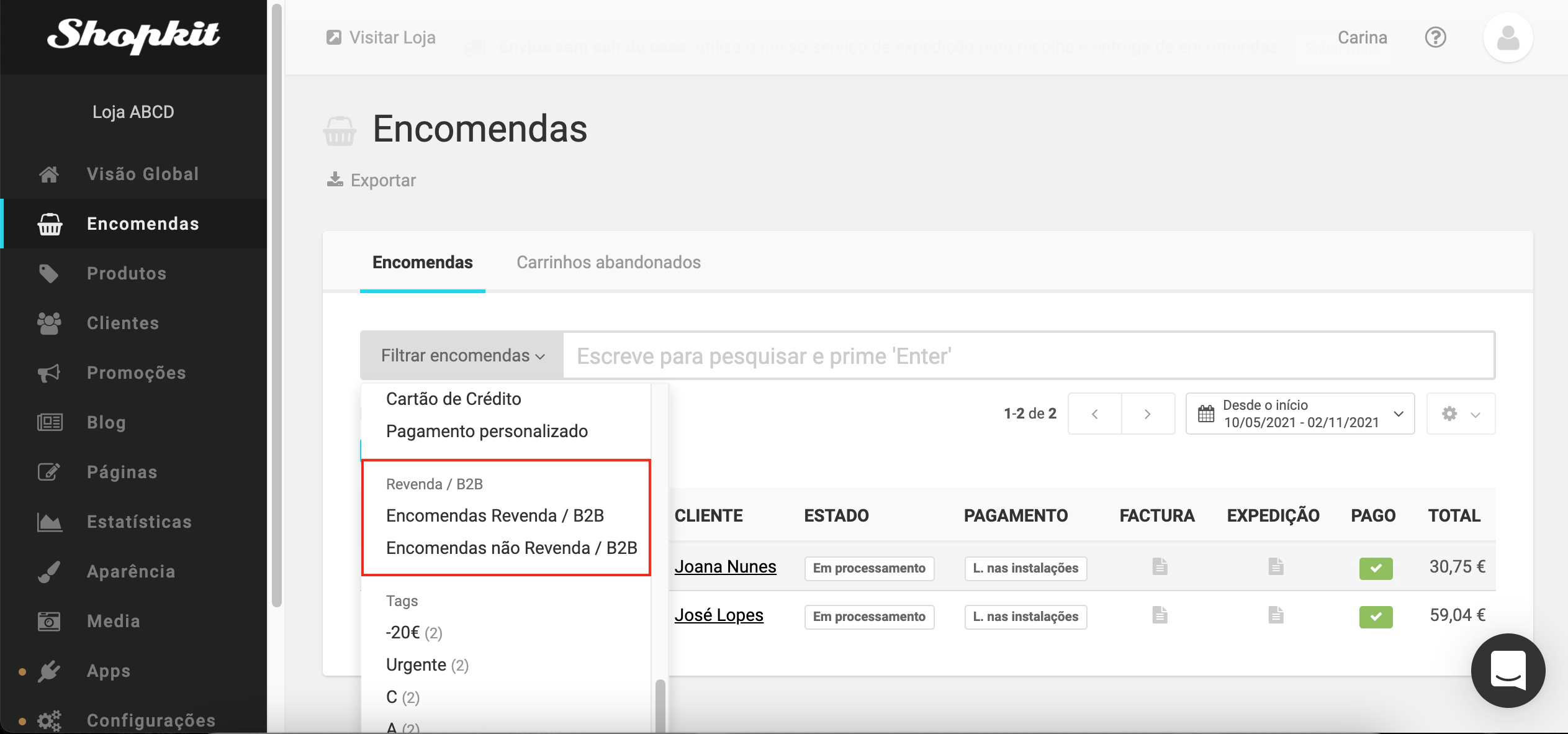 No menu Encomendas, podes filtrar as encomendas por Revenda / B2B ou Encomendas não Revenda / B2B.