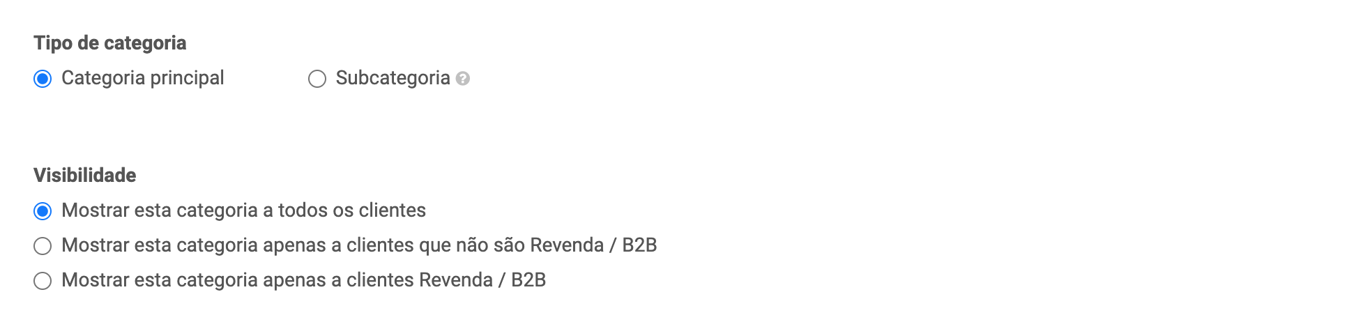 Apenas é possível editar a visibilidade de uma categoria principal se esta não tiver subcategorias associadas. No caso de uma subcategoria, a sua visibilidade é possível de ser alterada se a categoria principal a que esteja associada permita Mostrar esta categoria a todos os clientes e não tiver sub-subcategorias agregadas.