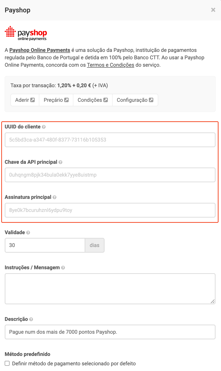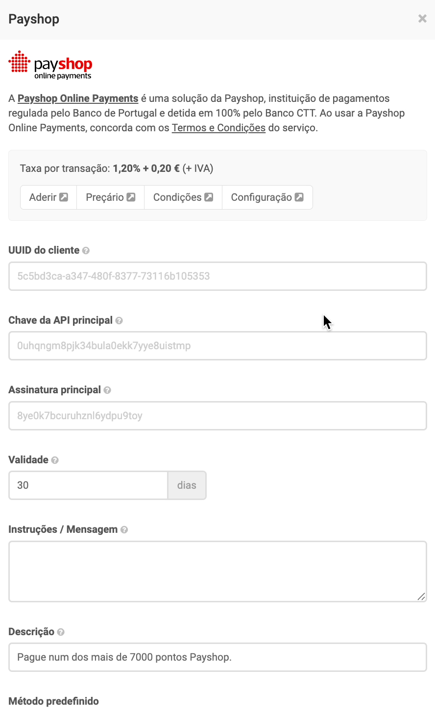A taxa de transação aplicada nos pagamentos por Payshop via Payshop Online Payments é de 1,85% + 0,30€ (+ IVA). Podes consultar as taxas de transacção na seguinte página: https://shopk.it/pagamentos-automaticos