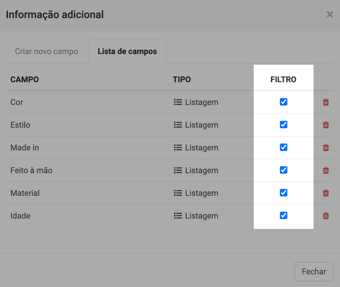 Este filtro permite segmentar a listagem de produtos com campos personalizados (ex. cor, origem, idade). Podes criar estes campos personalizados na ficha de produto, ao criar campos de Listagem, na secção Informação adicional.