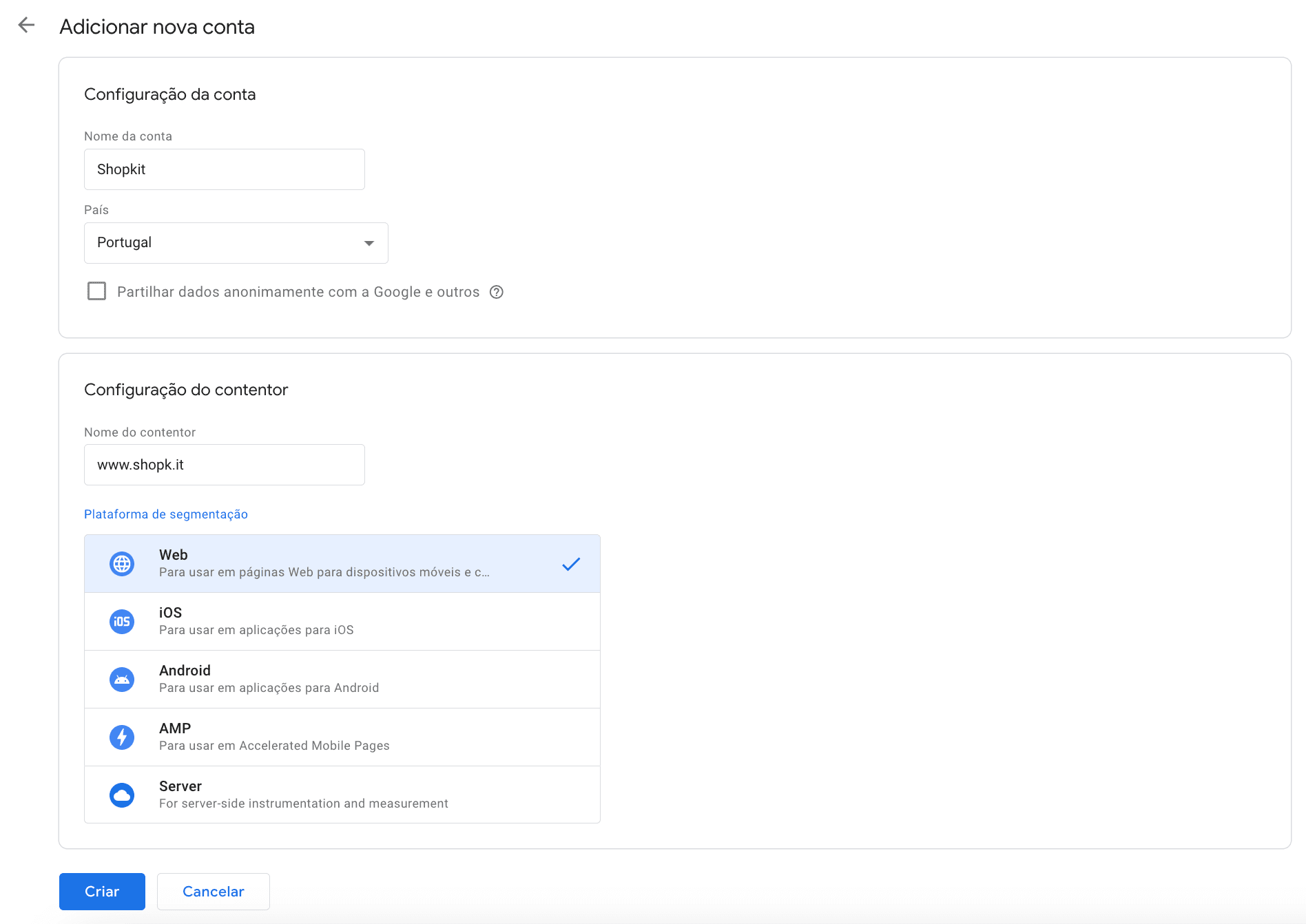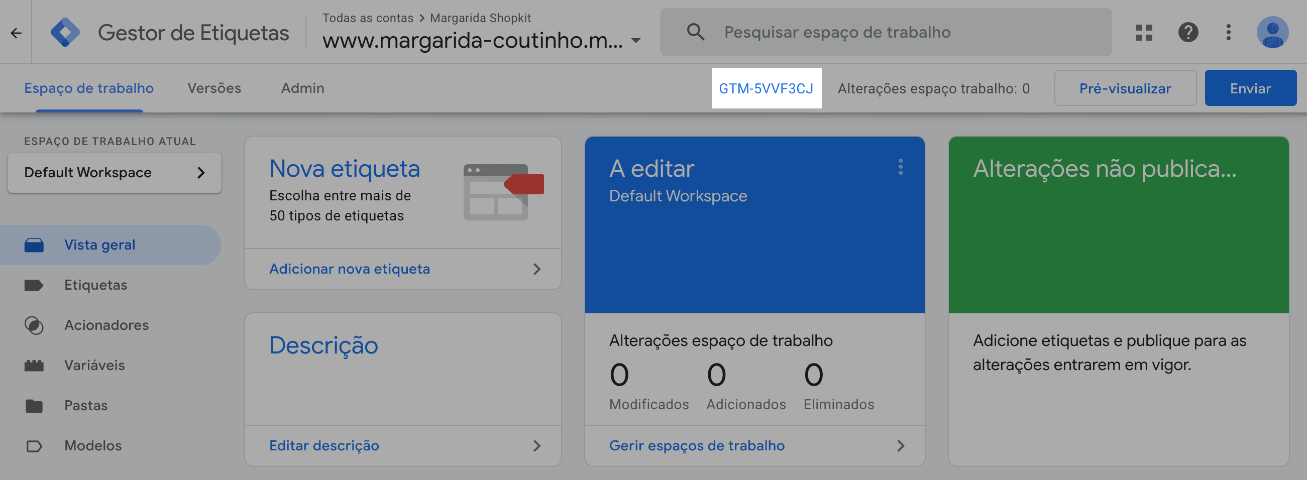 Cada contentor tem um ID único que é utilizado na instalação do Gestor de Etiquetas Google. Geralmente, tem o formato GTM-XXXXXXX e pode ser obtido após a criação da tua conta nesta ferramenta do Google.