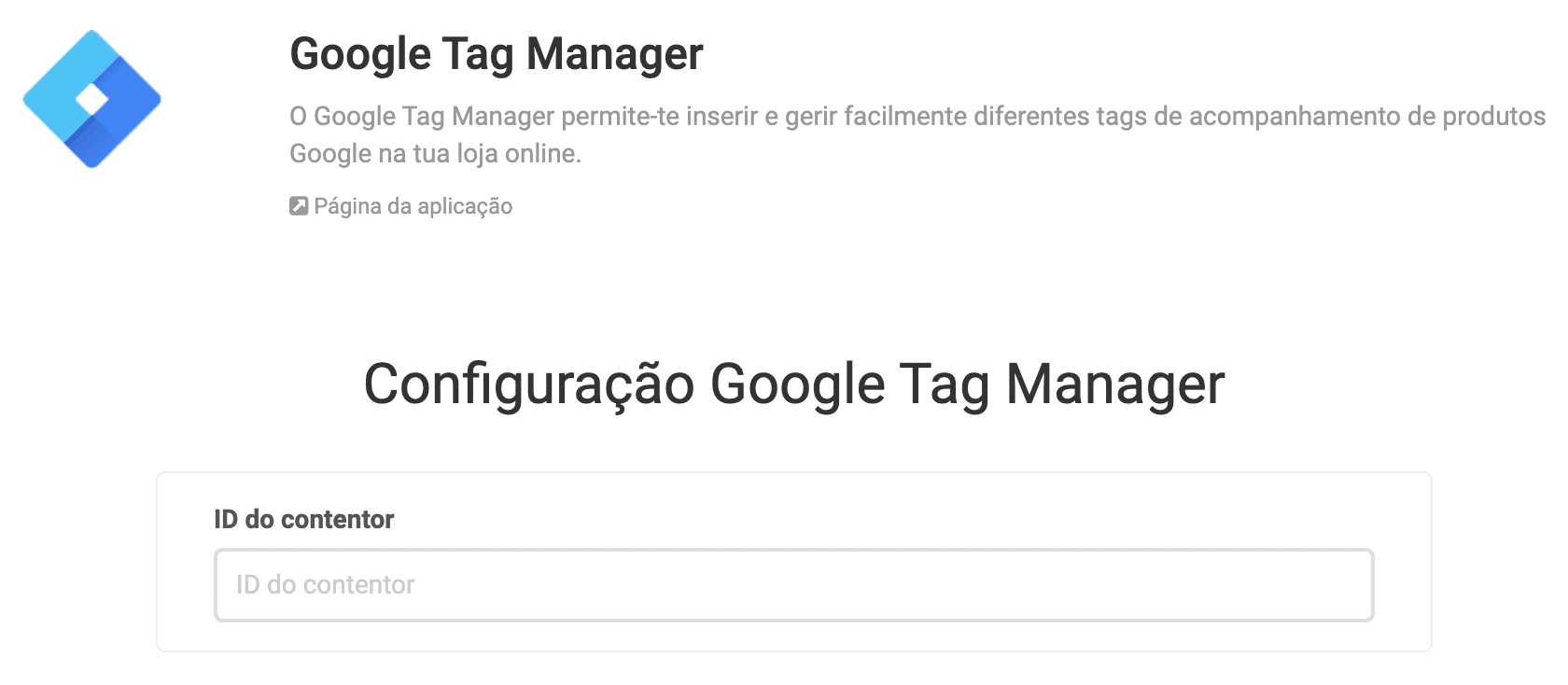 Para configurar a app Google Tag Manager, disponível no menu Apps / Análise, deves colocar o código do tipo GTM-XXXXXXX no campo ID do contentor.