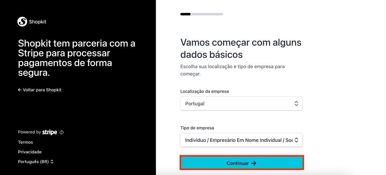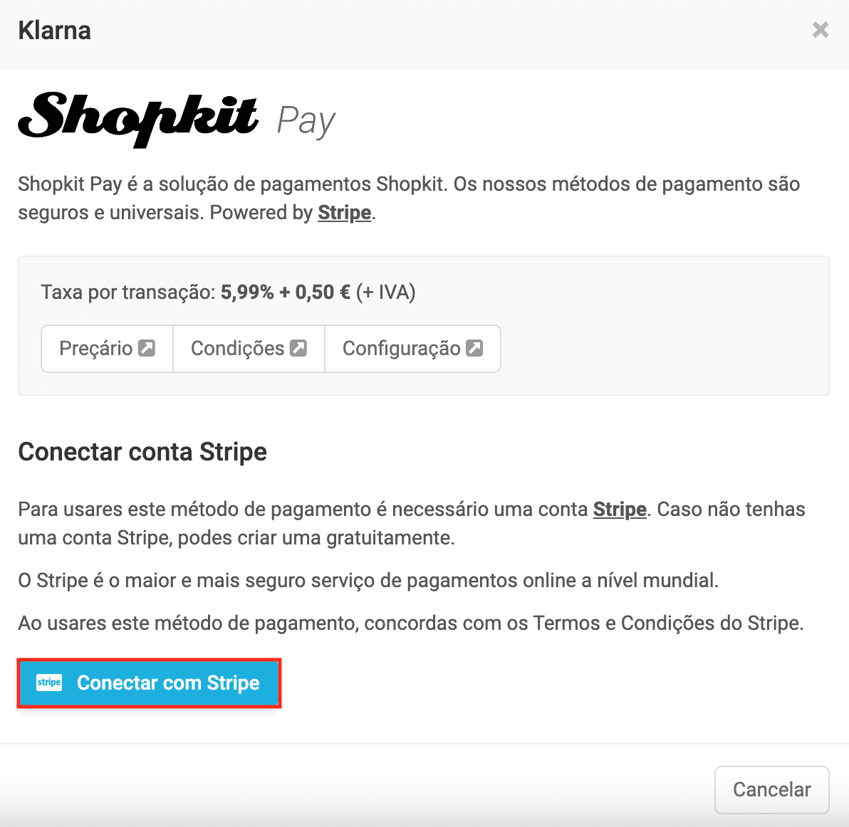 Antes de criares uma conta Stripe, consulta a nossa página de pagamentos e lê as condições de serviço Stripe e Shopkit.